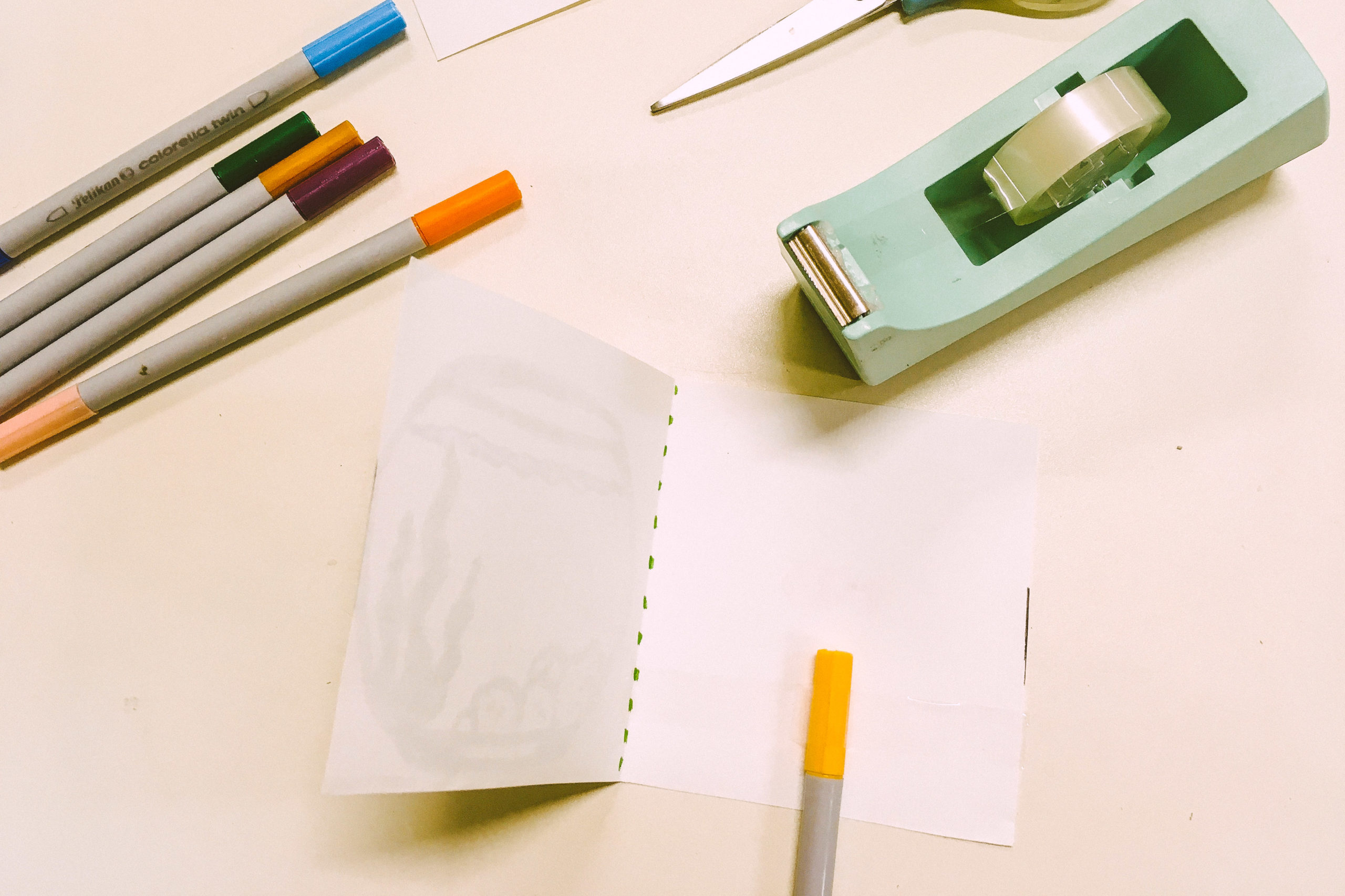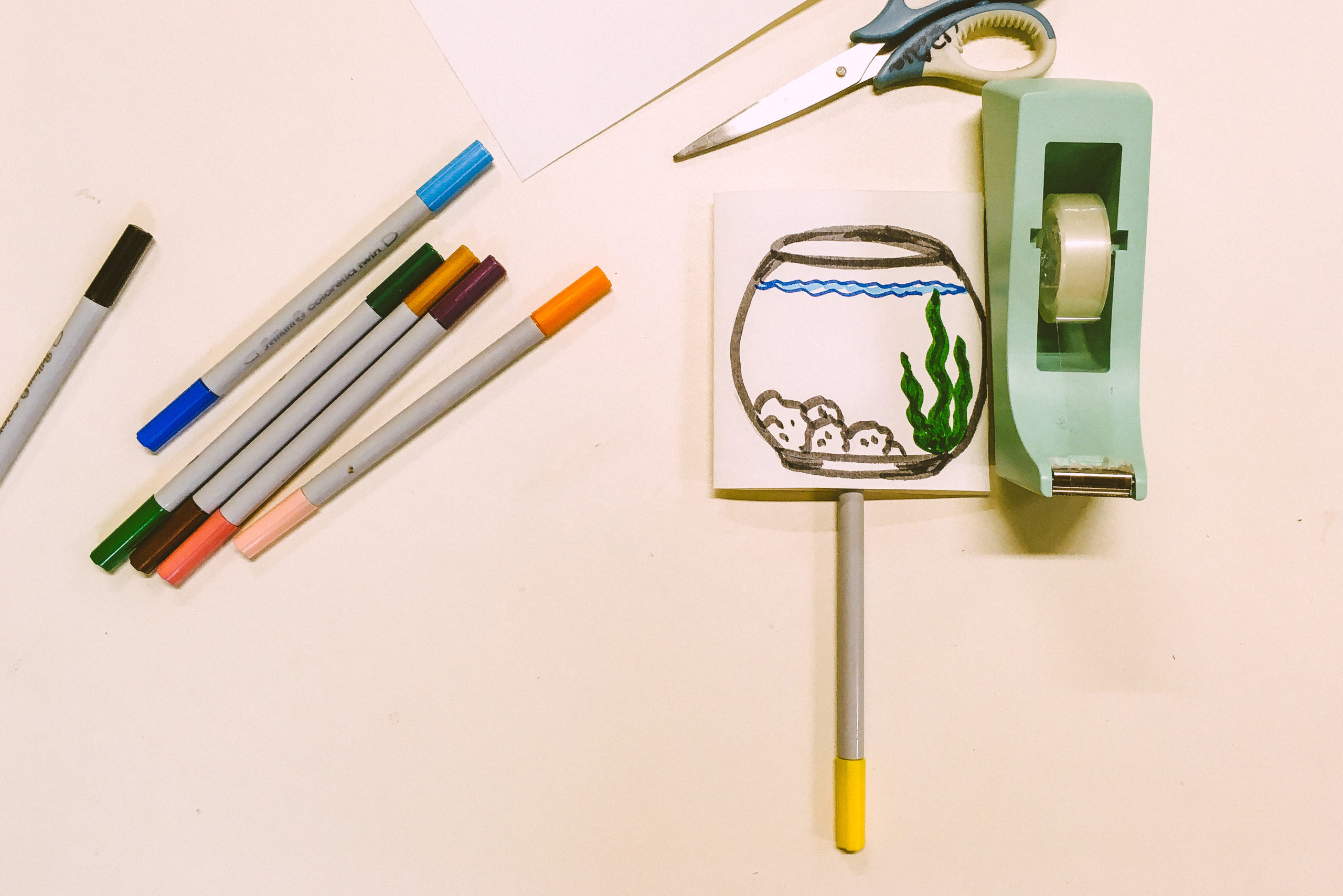 Fold a rectangular piece of cardboard in the middle, draw one part of the picture on one side and the complementary part on the other side, tape a marker or pencil in the middle, then tape the cardboard together.