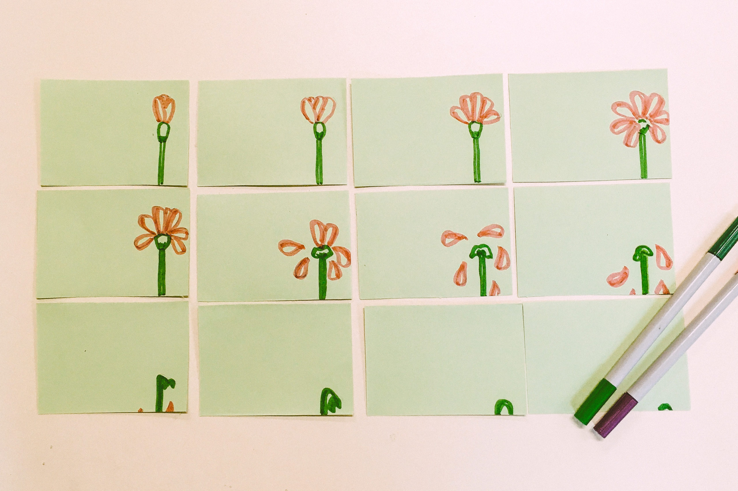 Bir flip book için kâğıt yerine karton kullanın, nesnenizi her zaman aynı yere yerleştirmenize yardımcı olacak bir şablon yapın ve ardından bir nesnenin farklı aşamalarını ayrı parçalara çizin ve renklendirin.
