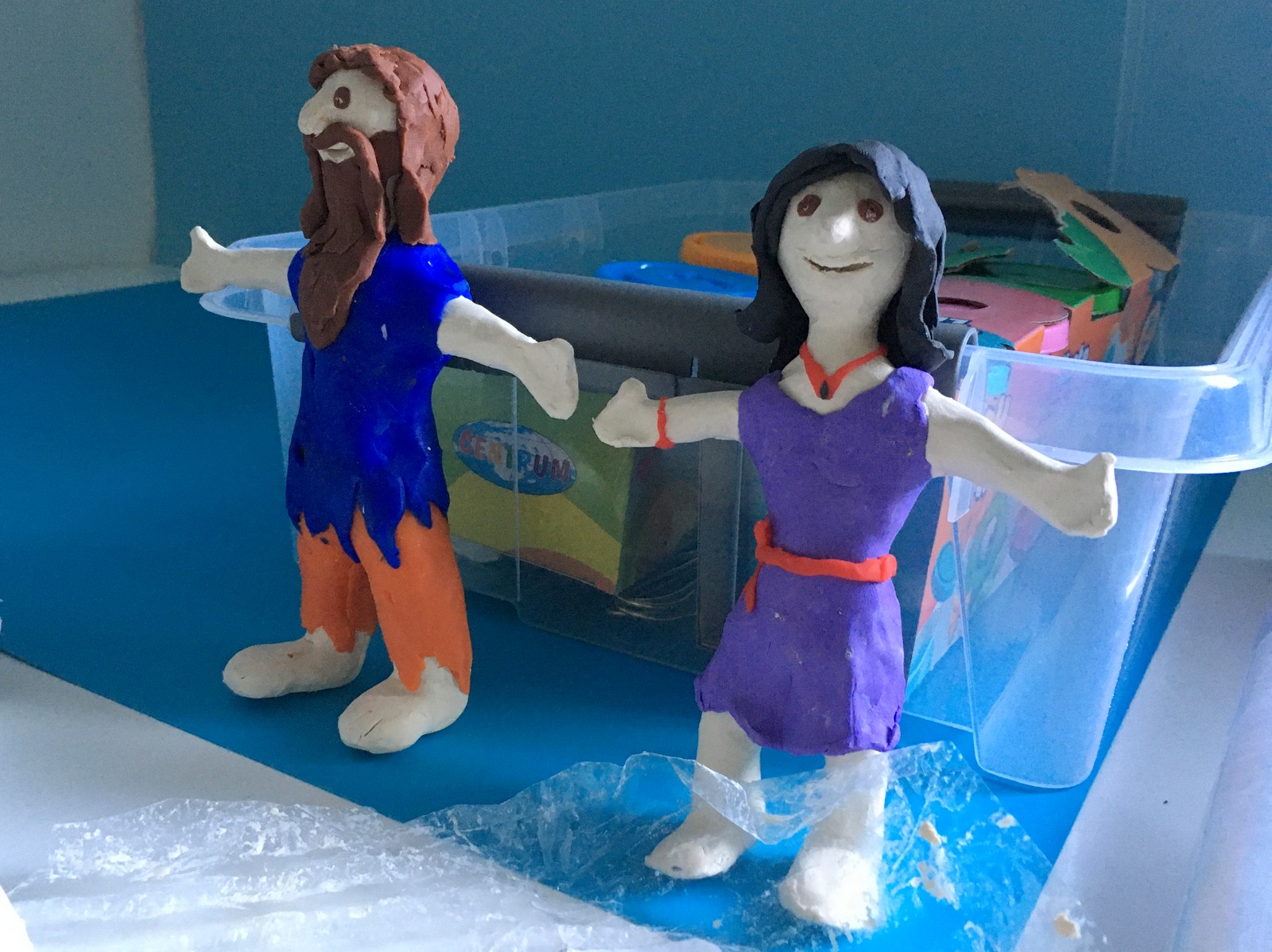 Plastisin, stop-motion animasyonlar yapmak için harika bir malzemedir. Üçüncü resimde nesneler ve arka plan için – plastisinin yanı sıra – küçük tahta parçaları, plastik folyo ve kağıt kullanıldığını ve dördüncü resimde figürleri şekillendirmeye yardımcı olmak için bazı aletlerin kullanıldığını görebilirsiniz.